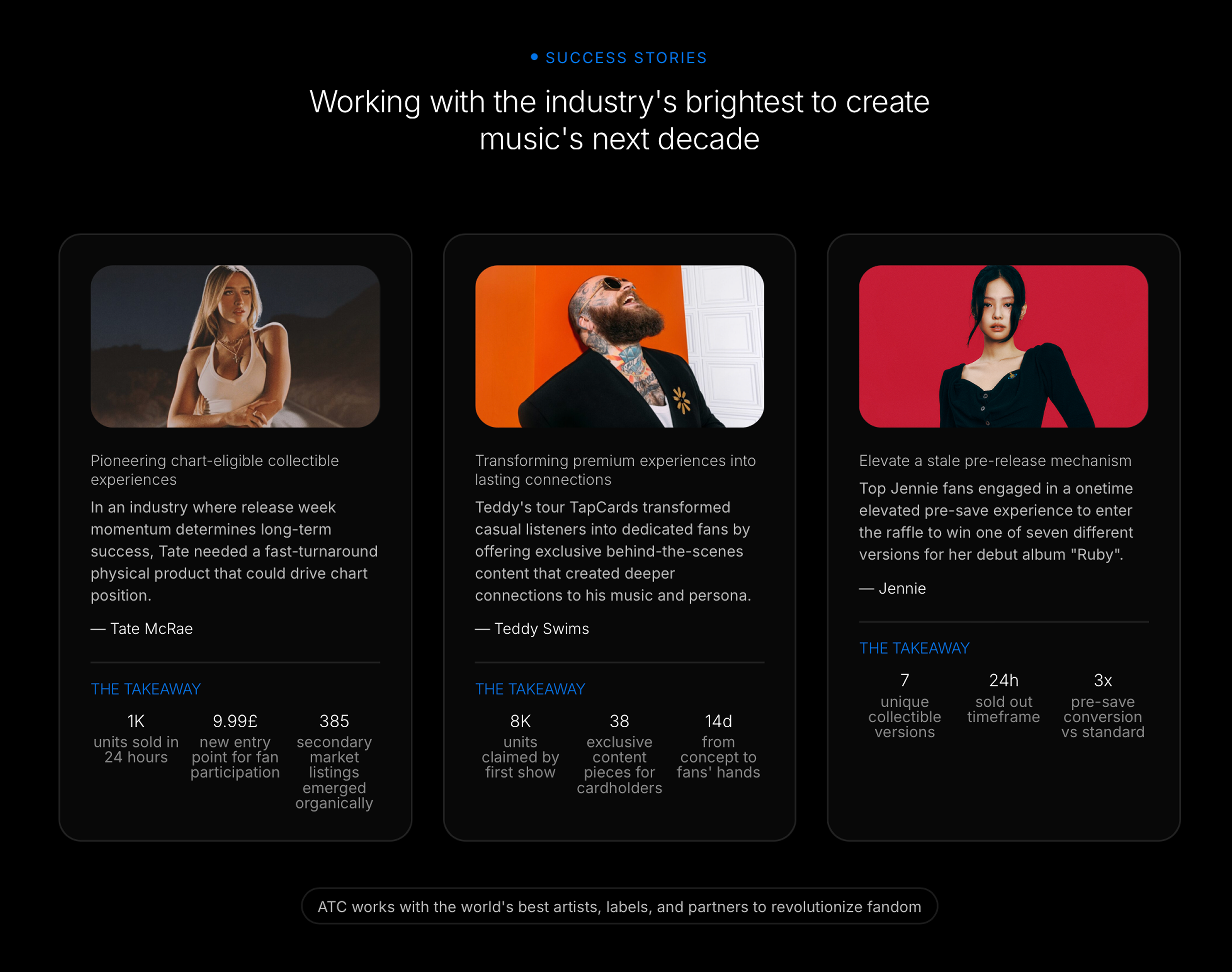At AllTimeClassic (ATC), we believe that while today's digital landscape offers unprecedented access to music, something tangible has been lost along the way. Our vision is to bridge the physical and digital worlds, creating meaningful connections between artists and fans through innovative collectible experiences.